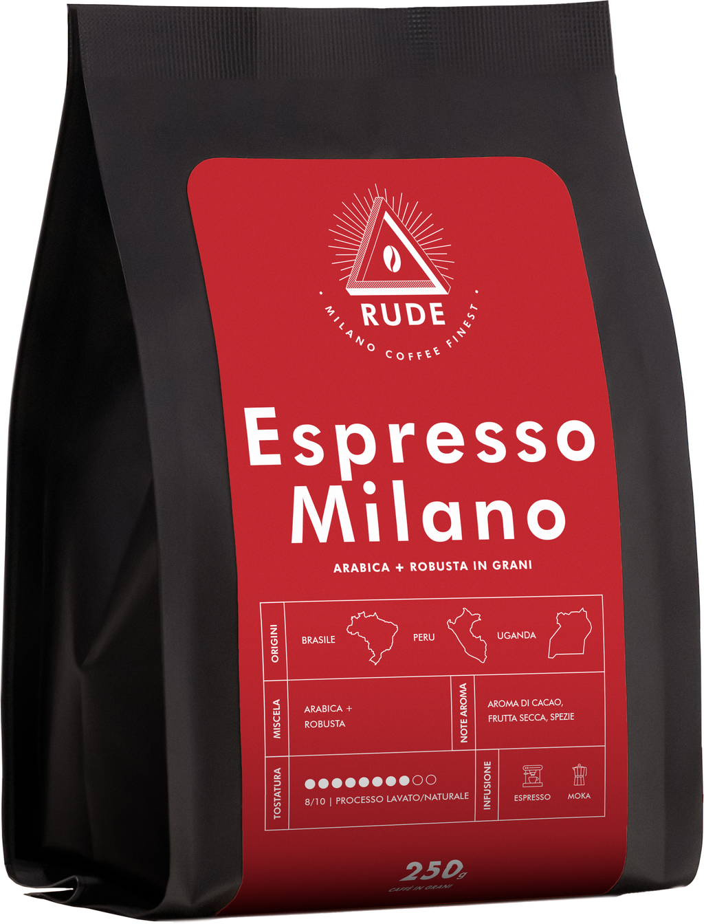 Una miscela di Arabica Perù, Arabica Brasile e Robusta Uganda, studiata per offrire un espresso dal gusto intenso, corposo e complesso. Le note di cacao amaro si fondono con un retrogusto persistente e piacevolmente tostato.